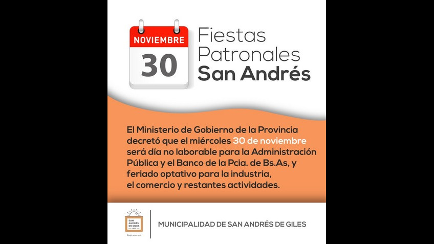El Ministerio de Gobierno de la Provincia decretó que el miércoles 30 de noviembre será día no laborable para la Administración Pública y el Banco de la Provincia de Buenos Aires, y feriado optativo para la industria, el comercio y restantes actividades.