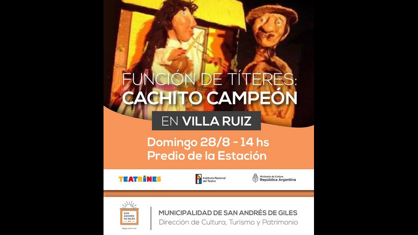 Este domingo 28 de agosto a las 14 horas, frente a la Estación del ex ferrocarril de Villa Ruiz, se presentará la función de títeres Cachito Campeón.