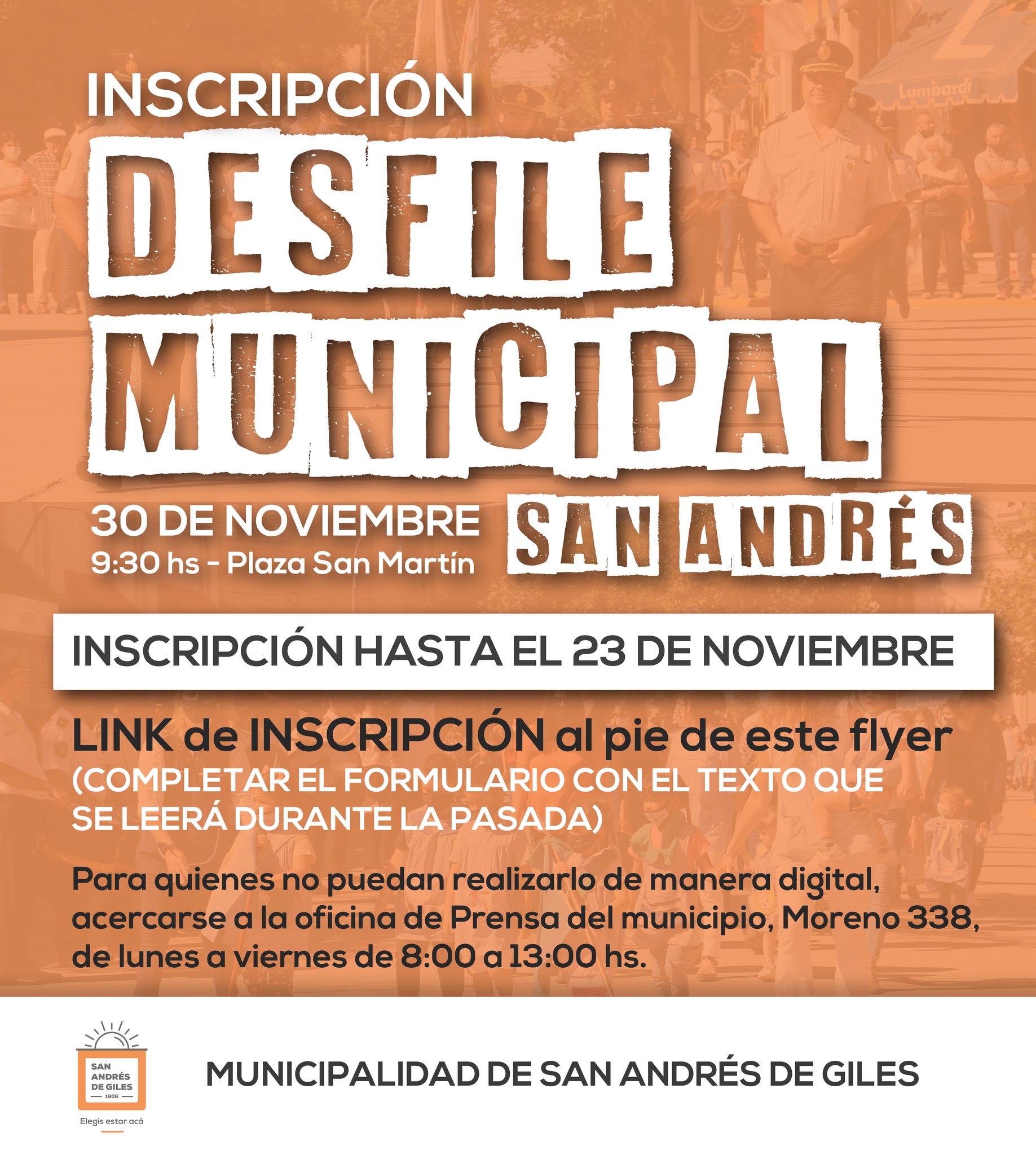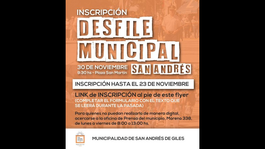 Se encuentra abierta la inscripción para el tradicional desfile cívico que se realizará con motivo de las fiestas patronales el día 30 de noviembre, 9:30 hs en Plaza San Martín.