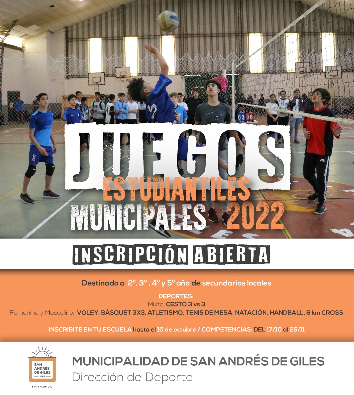 Destinado a 2º, 3º, 4º y 5º año de establecimientos educativos secundarios locales DEPORTES: Mixto: CESTO 3 vs 3 Femenino y Masculino: VOLEY BÁSQUET 3X3 ATLETISMO TENIS DE MESA NATACIÓN HANDBALL 6 km CROSS