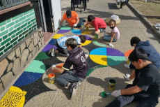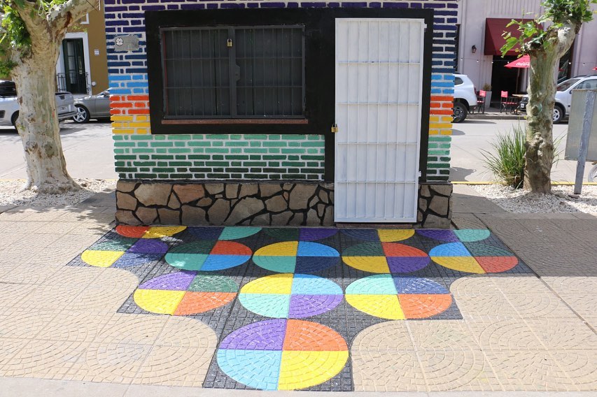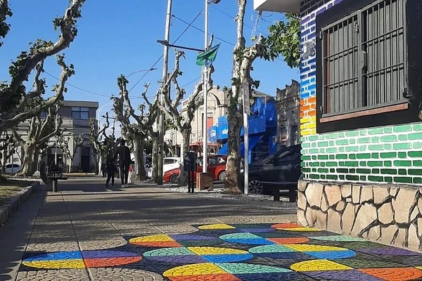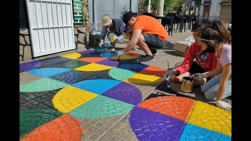 Niños y niñas junto a docentes de la Escuela de Educación Estética N° 1 Lola Mora y el Centro Educativo Complementario Nº 801 intervinieron con mucho color el sector de la Oficina de Turismo, en plaza San Martín