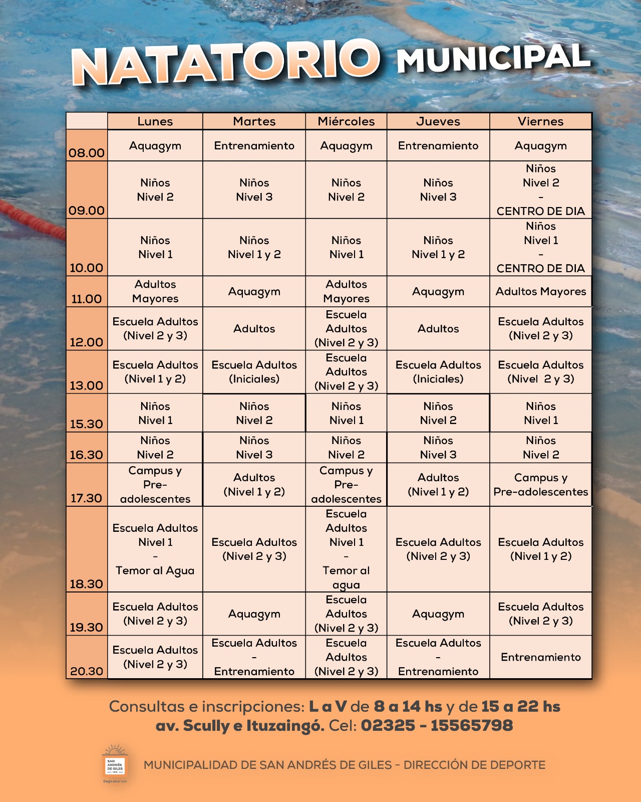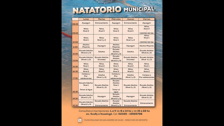 En el Natatorio Municipal se realizan numerosas actividades acuáticas, desde Entrenamiento hasta Aquagym. Promueve distintos niveles tanto para niños como adultos.