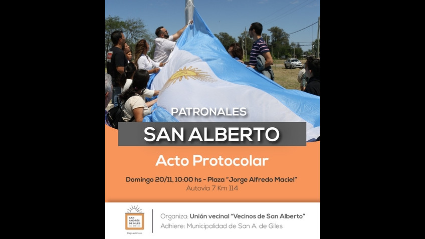 Acto Protocolar: Domingo 20/11 10:00 hs Plaza “Jorge Alfredo Maciel” , Autovía 7 Km 114 Organiza: Unión vecinal “Vecinos de San Alberto” Adhiere: Municipalidad de San A. de Giles