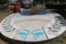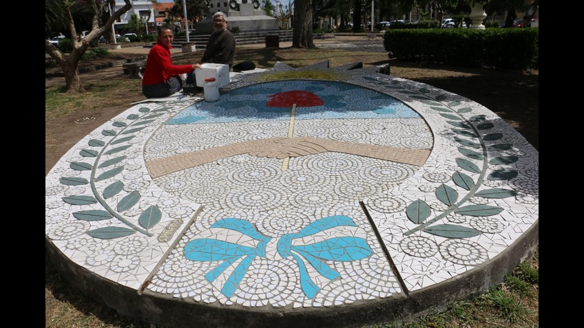 El arte, de la mano de la artista Sandra Piñeiro y su ayudante Alfredo Serrano, se ven plasmados en el avance del mosaiquismo aplicados a los escudos de la plaza San Martín.