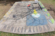 Sandra nos comentó que, si el tiempo acompaña, esta semana estará listo el escudo nacional, al que le falta colocación de más pedacitos de mosaicos. Al mismo tiempo, comenzó a armar el escudo municipal, con toda la complejidad que el caso requiere.