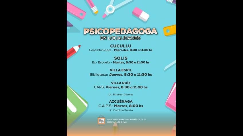 La Secretaría de Desarrollo Humano y Acción Social ofrece a los vecinos de las localidades en forma gratuita el servicio de psicopedagogas. Compartimos el cronograma.