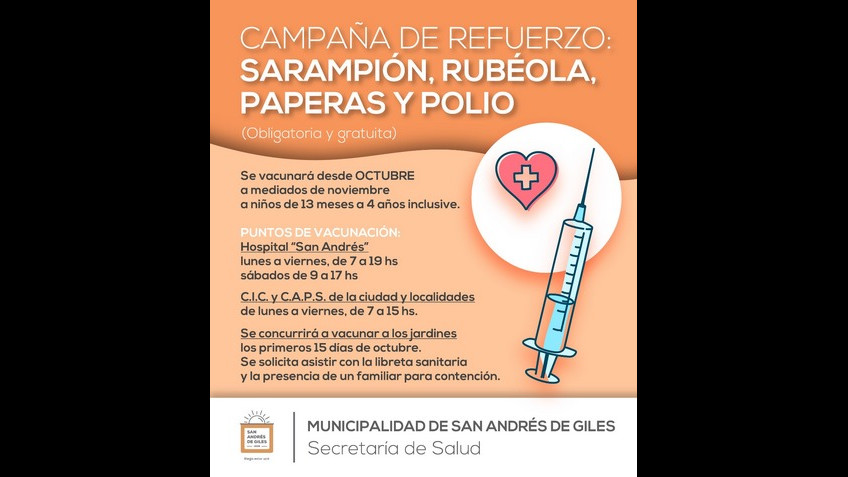 Desde octubre y hasta mediados de noviembre se realizará una Campaña de refuerzo obligatoria, gratuita, aplicando la triple viral contra el sarampión, la rubéola y la papera. También se vacunará contra la poliomielitis.