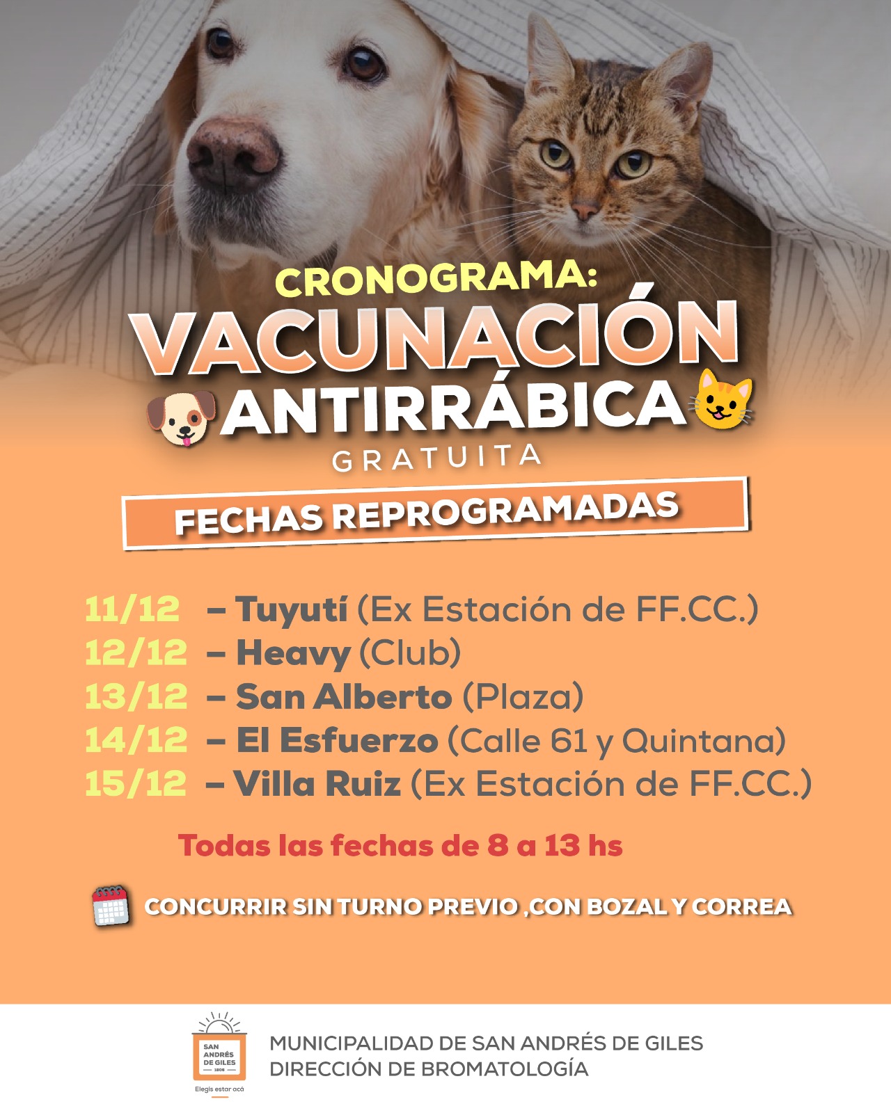 El Servicio de Bromatología informó la reprogramación de los puestos de Vacunación Antirrábica para perros y gatos suspendidos en su momento por mal clima. Siempre en el horario de 08:00 a 13:00 horas. Concurrir sin turno previo, con bozal y correa.
