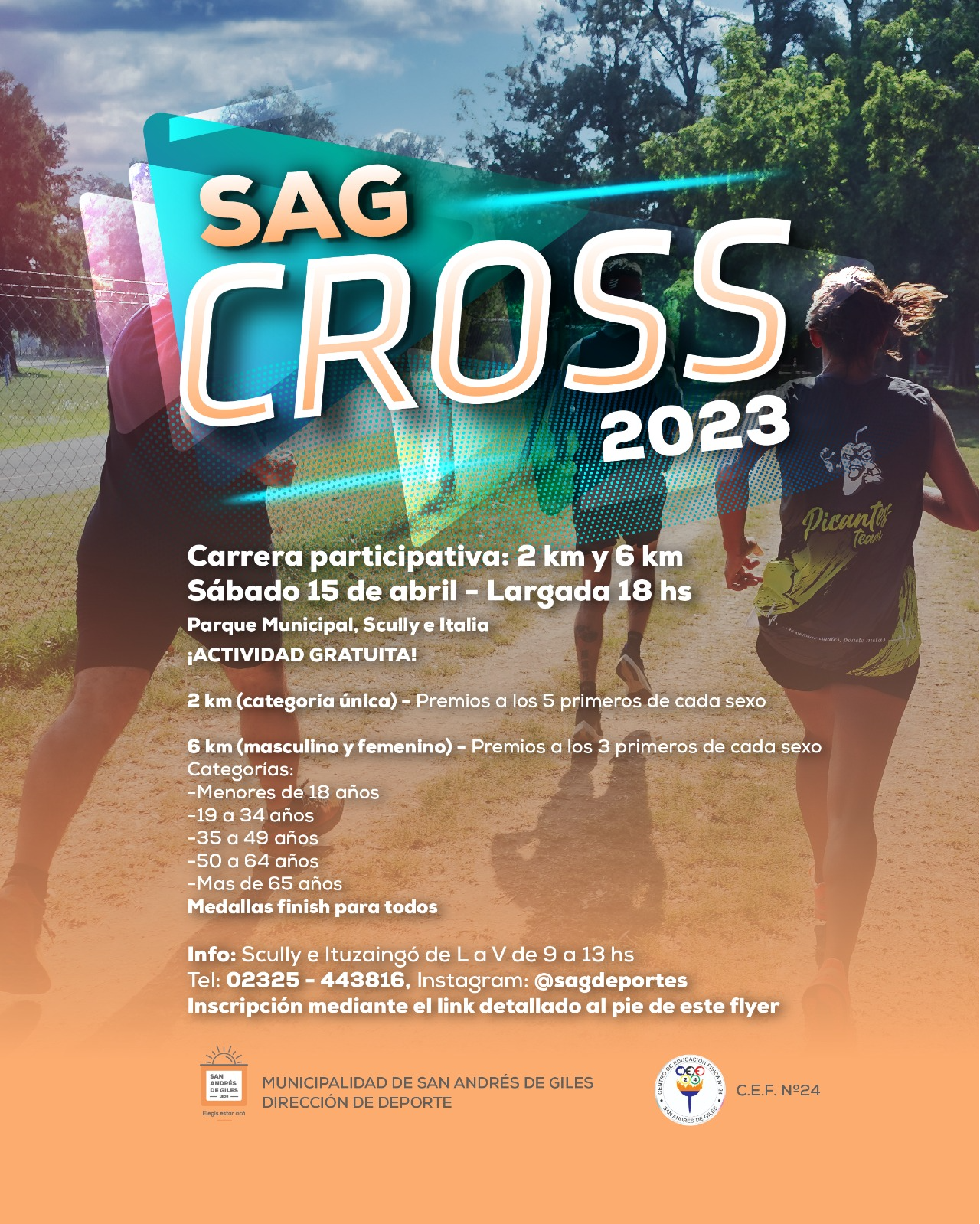 Organizado por la Dirección Municipal de Deporte y el C.E.F. Nº 24, se realizará el sábado 15 de abril el SAG CROSS 2023. La prueba es gratuita y comienza en el Parque Municipal, en av. Scully e Italia.