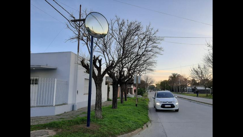 La mejora vial está siendo abordada en varios aspectos. Hoy la Secretaría de Obras colocó un nuevo espejo parabólico convexo en la esquina de av. España y Alsina.