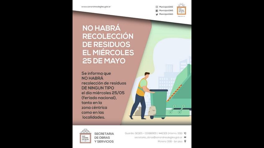 Se informa que NO HABRÁ recolección de residuos DE NINGUN TIPO el día miércoles 25/05 (feriado nacional), tanto en la zona céntrica como en las localidades.