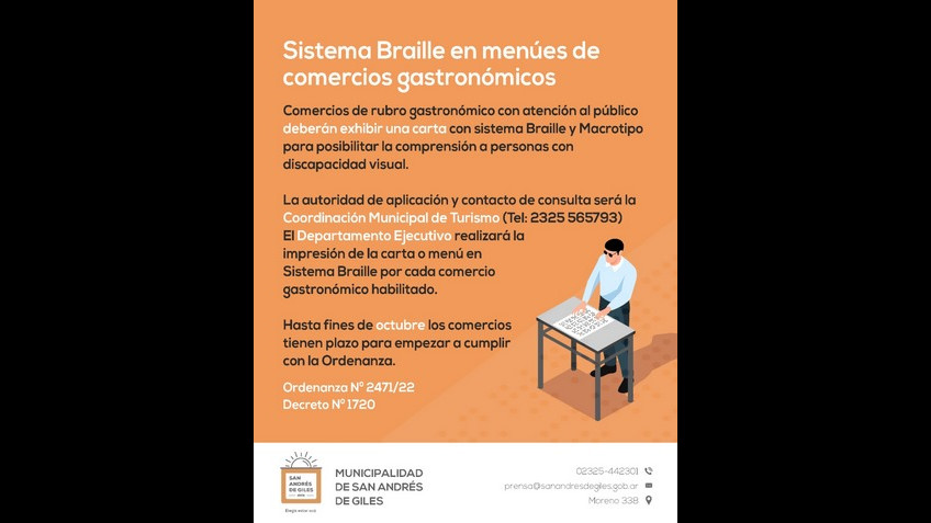 Comercios de rubro gastronómico con atención al público deberán exhibir una carta con sistema Braille y Macrotipo para posibilitar la comprensión a personas con discapacidad visual.