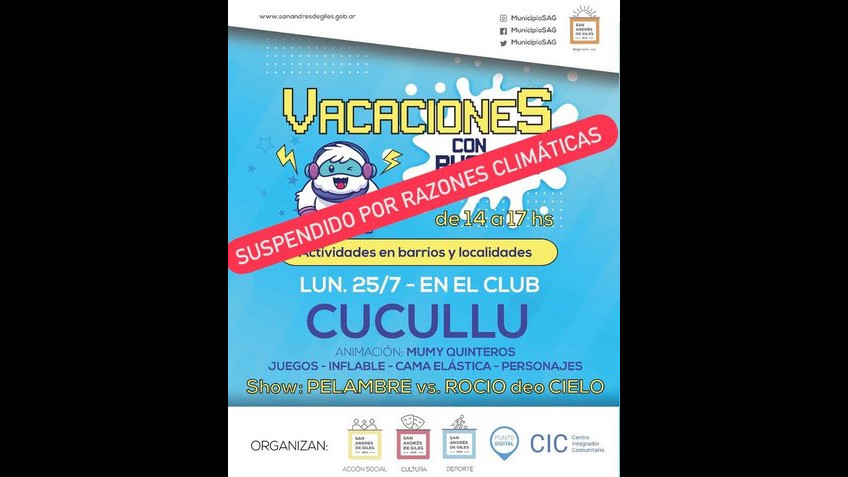 Por razones climáticas se suspendió Vacaciones con Bufanda para el día de hoy en Cucullu.