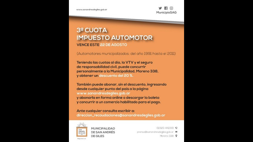También puede abonar este impuesto, sin el descuento, ingresando desde cualquier punto del país a la página www.sanandresdegiles.gob.ar y abonarla en forma online o descargar la boleta y concurrir a un comercio habilitado para el pago.